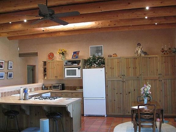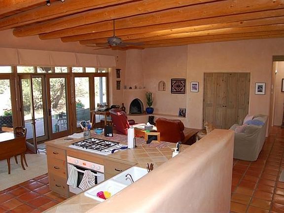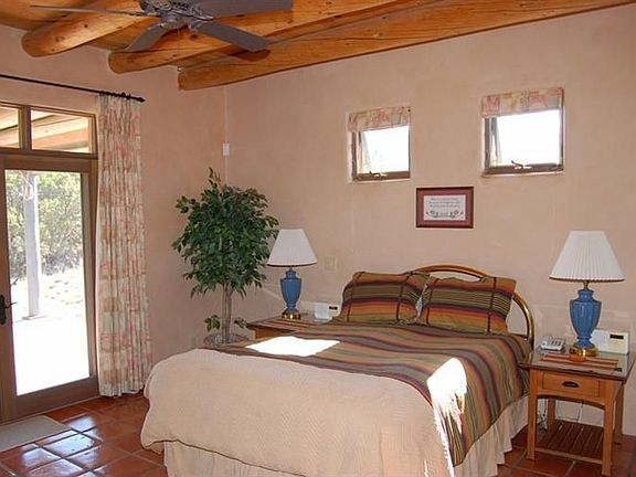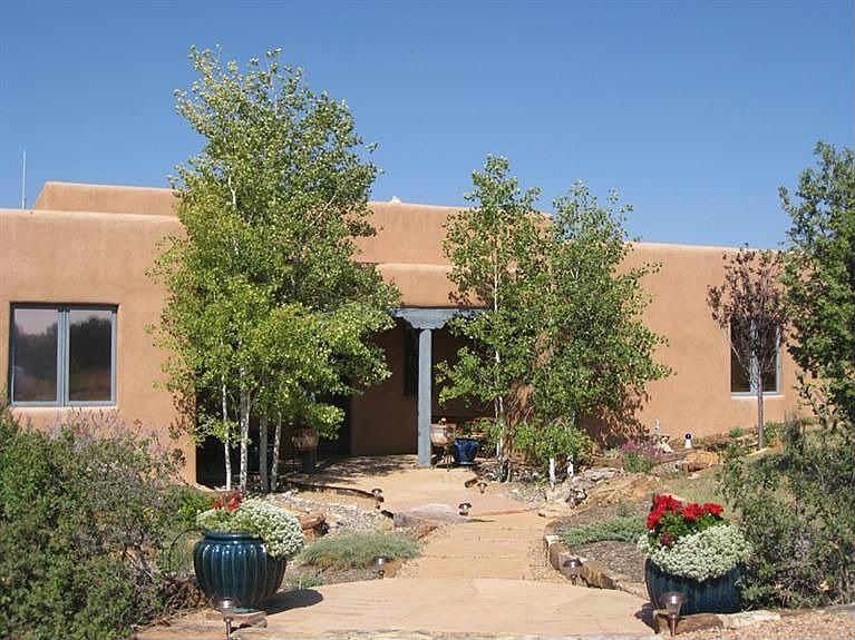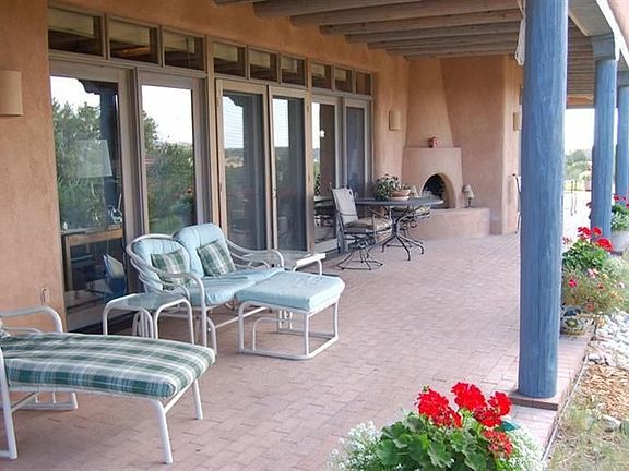 EAST RANCH custom built home at the end of a cul-de-sac, just south of Eldorado, sited on an elevated landscaped lot, with drip irrigation, to capture those outstanding mountain views. Split single level floor plan with Saltillo tile floors throughout, kiva fireplaces, French doors, tall viga ceilings and skylights. Expansive patio/ portal off the living area for entertaining and to enjoy those quiet and relaxing times. In-floor radiant heat, evaporative cooling, foam roof, oversized 2-car garage (almost 700 sq ft.) with laundry tub and ample built-in storage, security system. Even an audio wall speaker system throughout that offers individual room controls.