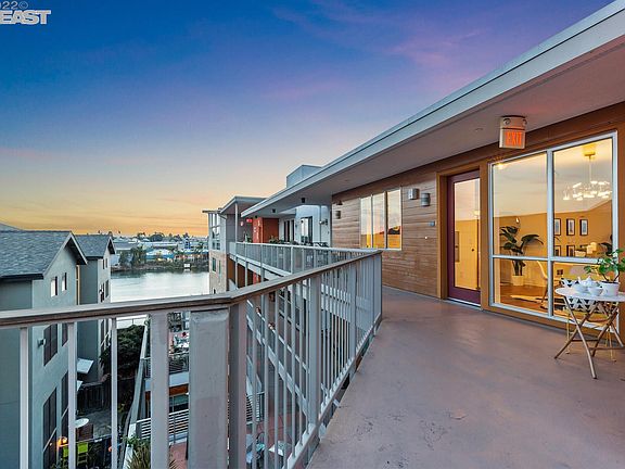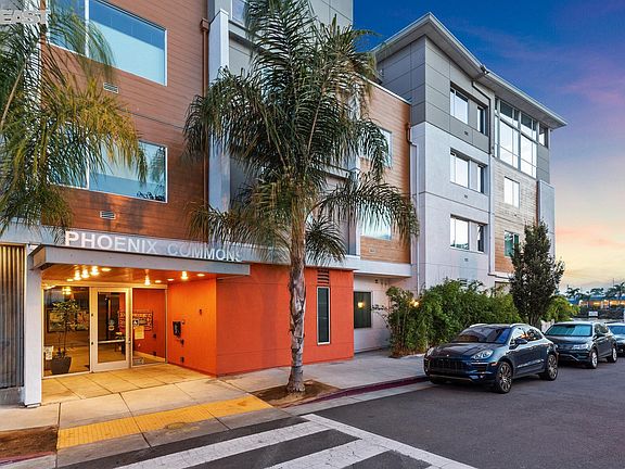 On the top floor of the Phoenix Commons waterfront community, 340 29th Avenue, Suite 410 is a light-filled 2BD/1.5BA condo with distant views of the San Francisco skyline, Bay and Golden Gate bridges, and Mount Tamalpais. Framed by corner windows overlooking the estuary, the home features soaring ceilings and an open floor plan, and a balcony off the living room is perfect for morning coffee. The open kitchen features a breakfast bar and the adjoining dining area is lit by floor-to-ceiling windows overlooking the sunny courtyard. Located just across the bridge from Alameda shops, restaurants, parks, and beaches, Phoenix Commons is a close-knit co-housing community - an intentional community of 55+ seniors, a blend of private homes and shared spaces. Numerous common spaces include a shared kitchen and dining room for scheduled community meals, library, media room, yoga room, fitness room, hobby/tool room, meeting spaces, and guest apartments for visitors. The community also provides shared outdoor spaces including unique open-air courtyard patios, community gardens, a group hot tub with an infinity swimming feature, and a large dock on the estuary. Additional convenient features include bike, paddleboard, and kayak storage areas and EV chargers in the secure/gated parking area.