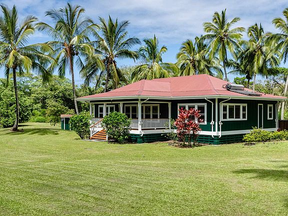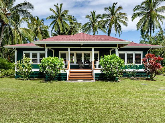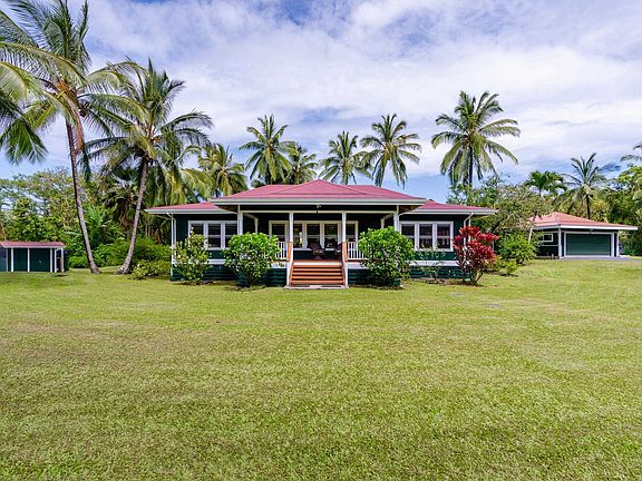 Postcard perfect property in Hana. This modern plantation home features the classic look of old Hawaii; with a corrugated metal roof, an inviting porch and plantation green color. Step inside and you'll experience the best of modern living. A large, open kitchen and great room area with soaring ceilings that make for a perfect entertainment space and of course high speed internet if needed. The kitchen includes beautiful cabinetry, Corian countertops and an island with a custom wood surfboard bar top. The spacious primary bedroom suite includes a walk-in closet, en suite bathroom with double vanities, slate flooring and an oversized walk-in shower. The home lives and feels a lot larger than its 1,792 square feet thanks to a floor plan that wastes no space, the soaring vaulted ceilings throughout and the abundant lanai areas. The covered front porch is the perfect spot to listen to the breeze rustle the palm fronds and watch the clouds dance along the lush, eastern slopes of Haleakala. There is a detached two car garage with extra storage, for beach chairs or garden equipment. This home is impeccably maintained, inside AND out. The scent of plumeria, gardenia and night blooming jasmine wafts through the air. An abundance of soaring coconut trees, avocado, breadfruit, starfruit, citrus, papaya, banana and lilikoi provide homegrown goodness. A lava rock planter off the back lanai is there for you to grow fresh herbs and vegetables just steps from the kitchen. There is potential for more orchards or garden space on the 2.9 acres. The home is a short stroll from the King's Trail and a beautiful coastal walk to Waianapanapa State Park. As an added bonus, you don't have to worry about hauling furniture on the Hana Highway. The home comes with furnishings, linens and kitchenware included. Call your favorite Realtor to set up a showing at this stunning Hana home.