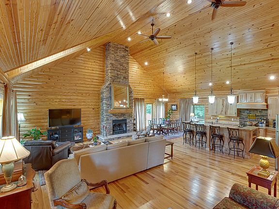 Prepare to be amazed by this unique one-of-a-kind, home with special features that will leave you in awe. Inside, the open living area, kitchen, and dining area exude rustic charm with log and timber accents. The hickory hardwood floors and hickory custom cabinets showcase attention to detail. An 18' stacked stone gas fireplace adds warmth and ambiance. The finished walk-out basement features an office/4th bedroom, a fully equipped kitchen, and a living area. The exterior walls are built with 2x6 materials for durability. A 500 sq.ft. front porch and a screened-in porch at the back provide perfect spots to relax. There's also a 32x20 deck with an outdoor fireplace for entertaining. The 24x48, 3-car garage offers ample parking and storage. Don't miss out on this extraordinary home.