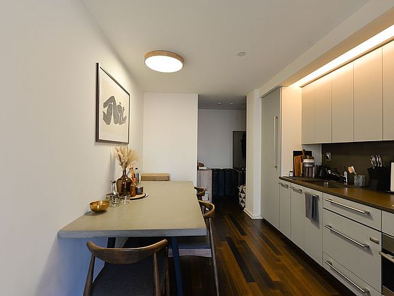 This impeccably designed one-bedroom, one-bathroom residence offers floor-to-ceiling windows that frame bright city views. The open kitchen is outfitted with premium Miele, Subzero, and Fisher-Paykel appliances, complemented by sleek stone countertops and rich wood cabinetry. The corner master suite enjoys both northern and eastern exposures and includes a luxurious bath with a glass-enclosed shower, marble and wood finishes, and a Duravit soaking tub. Additional conveniences include an in-unit washer and dryer for ultimate comfort and practicality.