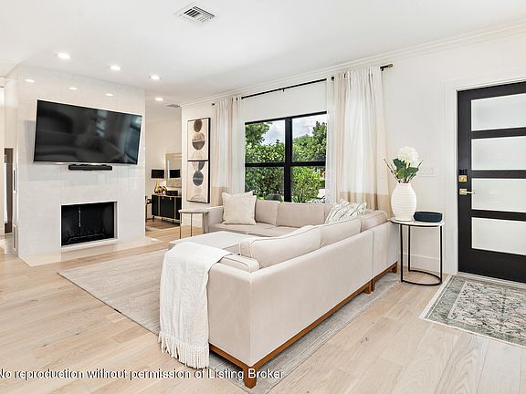 This beautifully renovated one-story residence, set on an oversized 9,750 sq. ft. lot, offers 3 bedrooms, 3 baths, and a thoughtful layout designed for modern living and effortless entertaining. Step inside to find a light-filled interior where recent updates elevate every space. New tinted impact windows, custom wood flooring, updated lighting with dimmer and Alexa-enabled switches, and custom cabinetry throughout create a refined yet comfortable atmosphere. The inviting living room features a wood-burning fireplace and a custom coffee bar, while the dining area and sunroom are adorned with electric window treatments. The chef's kitchen is equipped with Platinum Café GE appliances, a gas range with pot filler, wet bar with wine fridge, two-drawer fridge/freezer, and all new plumbing and electric. A dedicated LG tower laundry area with custom cabinetry adds both style and function. The primary suite overlooks the pool and offers a new spa-inspired en suite bath complete with custom cabinetry and upgraded fixtures. Each additional bedroom is well-appointed with access to beautifully updated baths. Outdoors, a private resort-like setting awaits. The newly built saltwater pool and jacuzzi, complete with a gas heater, AquaLink controls, and automatic water filler, are surrounded by new hardscape pavers. Additional highlights include an outdoor shower, sprinkler system, freshly painted exterior, keyless entry, and lush landscaping designed for low-maintenance elegance. With upgrades at every turn from ceiling fans and insulation to thoughtful smart-home touches this property represents the best of turnkey living in West Palm Beach. Perfectly blending modern convenience with timeless design, this home is ideal for those who value both comfort and sophistication.