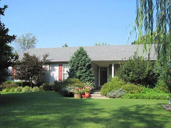 Cute rustic ranch home in a great neighborhood, 3BR, 2BA, open great room with eat in kitchen, stone gas fireplace, 2BR detached garage, beautiful landscape and partial basement with an extra garage. Close to boat ramps and marina.