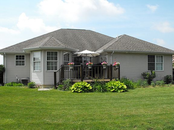Style: ranch; 3 bedrooms 2 full baths, large kitchen and family room, dining room, guest room, breakfast room, spacious entry, plenty of closet space including walk-in closet; utility room, two car garage, full unfinished basement, lot size 150 x 100 feet, covered porch, and UltraDeck composite deck; Heat/AC forced air (natural gas), city water and sewer Outer finish: stone, vinyl; trim finish: poplar and maple; flooring: hard wood, tiles, Permastone, carpet, Anderson windows, stainless appliances including dishwasher and trash compactor Kitchen: 4 walls of maple cabinets, 3 x 3 island, Formica countertops, recessed lights, lights under cupboards, pantry, stainless sink with detergent dispenser, and garbage disposer, trash compactor, dishwasher; Master bathroom: 6 jet whirlpool tub, bidet, shower stall, pedestal sink, elongated toilet bowl; Laundry: utility sink, in-wall ironing board, linen cupboards Garage: 18 door with opener, epoxy coated floor, drywall Family room: cathedral ceiling, 6 dimmable wall sconces.