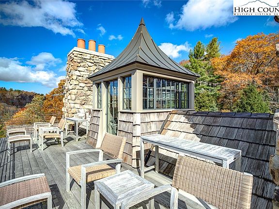 One of NC's most iconic classic mountain home. Details & quality materials unheard of today. Located on the gorge rim in Historic Laurel Park! Home featured in Finding Home, The Homes of Pursley Dixon Architecture. Many artisans from all over the world came together to make this home possible. Easy walk to downtown Blowing Rock. Floor to ceiling windows help to take in the unsurpassed views of Pisgah National Forest. French Oak Timbers, Cut Limestone, Cedar shingled Roof, Custom Ironwork, Thatched Roof Carport, Steel-Framed Doors, Cantilevered Porch, Hidden Venetian Plaster Stairwell leads to very dramatic cupola rooftop terrace. Truly designed for ease of maintenance and reside on one level. However, it does have an Elevator and 2 Laundry Areas, 5 BR's(Flex Space Room/Study/Bunk has no closet), 5 Full Baths and 2 half baths. Furniture was custom designed for certain spaces. Design team for architect handled all designs. Park like setting with a secret garden area, hiking trail around the perimeter of the lot and many rock outcroppings. Home perfectly situated on 2 lots, street to street with full view control. The arched fieldstone boulder entrance leads you into a grotto like space, facing the arched custom door and what that door opens onto, truly takes your breath away. The home has the perfect balance of modern comforts and LUXE elegance with classic mountain cottage details. The owners and the architects designed a home that is fun to live in and at the same time providing them with an amazing home, flawless for entertaining. No details here were overlooked. The hardscape and landscape plan is perfection that gives you an almost hidden drive and plenty of parking, all on a flat space. For car folks, the oversized 2 car garage has plenty of room for other toys as well. All custom cabinetry by Banner's Cabinets, Inc., 6 amazing fireplaces. 1600 Sq. Ft of covered outdoor space (porches & carport). Builder-Matthew Collins-Paradigm Homes. Furnished with Exceptions