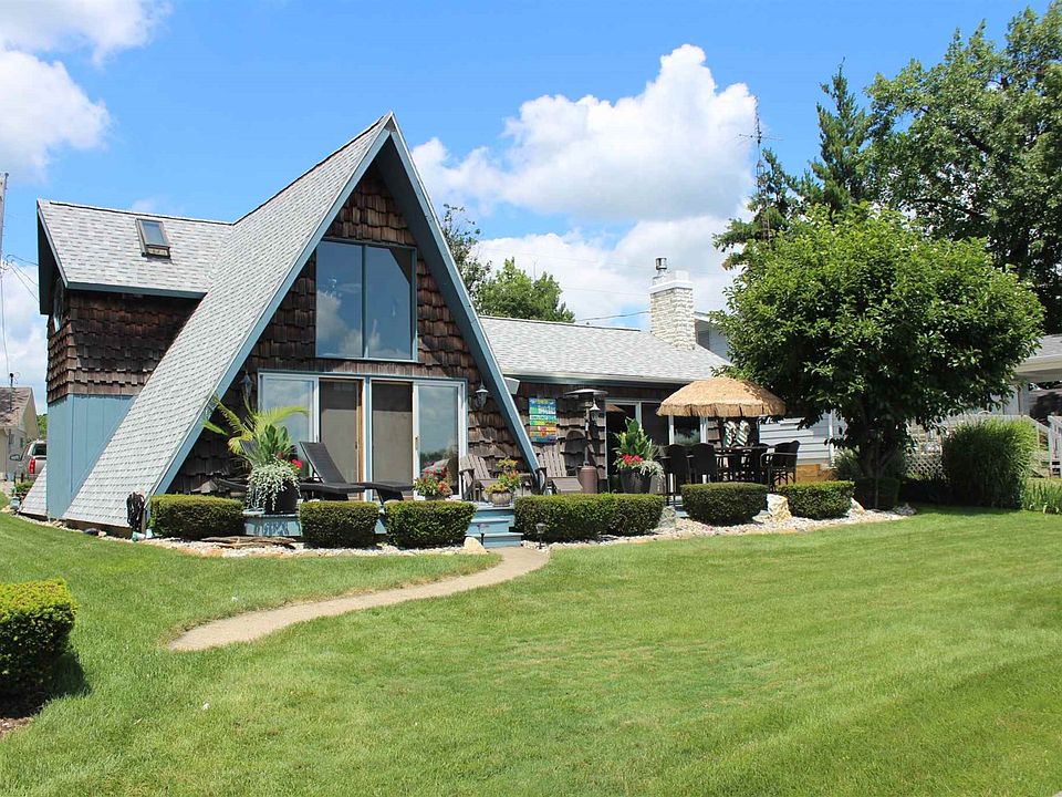 OPEN HOUSE SUNDAY JULY 28TH FROM 2-4 PM! 75 feet of pristine lake front on Deer Island at Snow Lake, part of the Lake James Chain! Not many come up for sale at this unique location, you'll find out why as you fall in love with the sound of the waves & the lake breeze plus the beautiful views of Pokagon State Park! Check out this charming, year round, A-Frame style home built in 1970 with 2 bedrooms and 2 full baths. Open and airy kitchen provides ample counter space and cabinet storage. Huge lakeside living room with limestone fireplace & gas insert plus sliding glass doors that lead to the lakeside deck. Tons of storage, you'll be surprised - built ins, closets, cabinets, etc. Main floor laundry & mechanical room, entry area with storage closet & garage access. 2 car attached garage and paved parking for 3-4 additional vehicles. Additional storage in shed by dock. This is a very well cared for property on a level lakeside lot in a highly sought out location. New Roof 2017. Golf cart friendly community, convenient location close to shopping & highways.