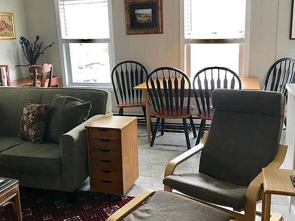 SHORT TERM RENTAL. Avaialble starting 4-1-2019. Rented by the week or more. This unit includes all utilities and is a fully furnished 2 bedroom apartment. This apartment is located in downtown Wakefield above new pizzeria. 3/10ths of a miles to commuter rail (North Station/Haverhill Line). Walk to commuter rail and all of local businesses, park, and lake. 14 miles to Boston and 12 miles to north shore beaches and attractions. Two level apartment with open living room, eat-in kitchen area. Kitchen completely functional with Microwave, toaster, and coffee pot, pots, pans, etc. Master bedroom with queen bed on floor one, and one bathroom with stand-up shower. The skylit second floor of unit has a den/family room with a futon couch and second flatscreen and the large open bedroom has a queen size bed, two twins, a large closet, bureau and work area. Linens provided. Washer/dryer. Will sleep 6 people. Up to 8 people if using the futon. On street parking.