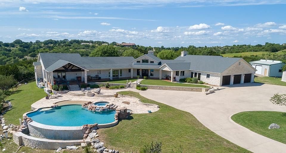You will never tire of the spectacular views from this hill top ranch tucked away in gated Creekwood Estates. Overlooking the pool, you will find miles of tremendous hill country and water views. This spacious single level home has 4 bedrooms and 4 full baths with 3 living areas, 2 dining spaces, wet bar with wine fridge and ice maker and a large gourmet kitchen. This home is perfect for entertaining both inside and out with 2 indoor fireplaces and 1 outdoor fireplace and fire pit. Wonderful details include wood windows, wood interior doors, steam shower, large closets, 3 HVAC units, 3 hot water heaters, 500 gallon propane tank, barn, outbuilding, fence, concrete driveway and much more. Want to feel like you are out in the country but still convenient to everything, this is the perfect place! It is just minutes away from HEB, shopping, medical, and the airport.