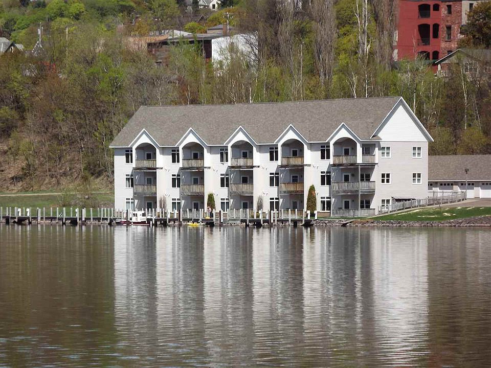 Remodeled in 2011, this condo on Hancock's waterfront offers turn key occupancy with most furnishings. Just bring your toothbrush and settle in. Glorious view of the Portage Waterway and lift bridge. Comes with garage (#9) and dock. Kitchen upgrades include stainless appliances, granite countertops, lighting and fixtures. Ceramic and engineered floors and tasteful decorating make this home feel like home.