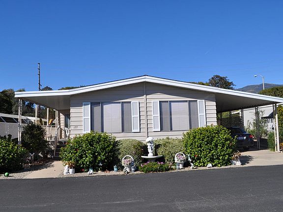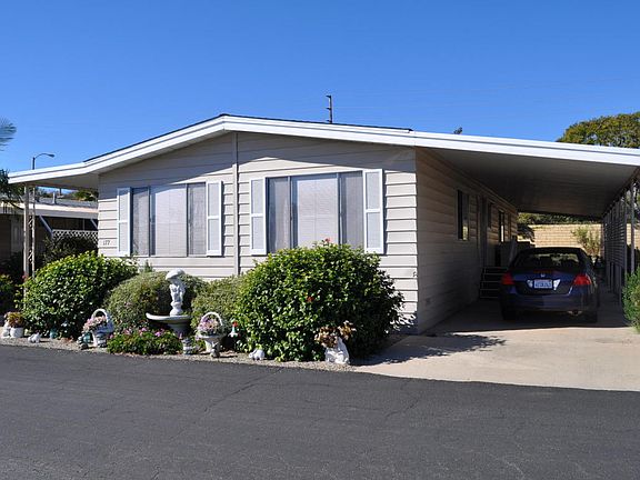 San Vicente, a gated community for adults 55+ with year-round heated pool, spa, tennis courts, gym, - San Vicente, a gated community for adults 55+ with year-round heated pool, spa, tennis courts, gym, and clubhouse! 1,650 sq. ft. triple-wide home. New roof in 2015! Newer exterior paint and carpeting. Formal living & dining rooms with vaulted ceilings and built-in buffet & china cabinet. Large kitchen with pantry, built-in appliances and breakfast bar adjoining spacious family room with sliding doors to the covered front deck. Rear master suite has a walk-in closet, office/retreat, and bath with double vanities & sinks and shower. Second bedroom has large closet and access to full bath with tub and shower. Separate laundry room. Central heat and AC! Rear patio and terraced garden area. Space rent just $592 per month and includes ALL water, sewer, trash & recycle!