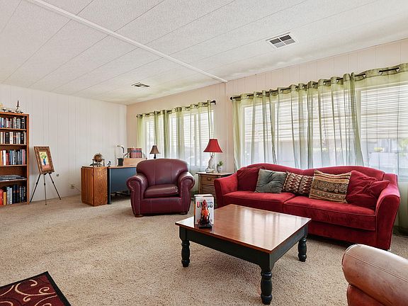 San Vicente! A gated resort community for adults 55+ with a year-round heated pool & spa, tennis & pickleball courts, clubhouse with library and private gym. This 1978 Silvercrest home offers over 1,400 sq. ft . of living space on one level. Front living & dining rooms with built-in buffet & china cabinet. Center kitchen with breakfast bar opens to the family room and sliding door to covered deck. Primary suite has large closet and bath with dual vanities. Guest bedroom has access to second bathroom. Separate laundry room. Large storage shed. Covered deck and open backyard space. 3 car driveway. Space rent just $757 per month and includes water, sewer, trash, recycling and use of all park amenities!
