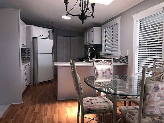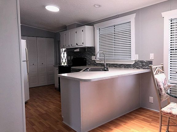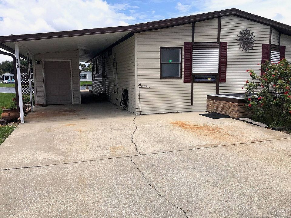 Freshly painted in light gray and white. Laminate flooring in bedrooms and kitchen, golf cart garage with extra parking space. Plantation blinds throughout. 1512 sqft of living space. Great kitchen and layout. Extra long shed with garage door.