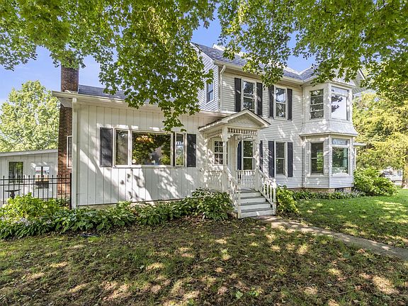 Charming Victorian with great curb appeal and relaxing front porch. All the features you would expect in this era home plus more. Open staircase, original hardwood floors, custom wide trim woodwork, pocket doors, stained glass windows. The rooms have high ceilings and are light and bright. Chef's dream kitchen with brick fireplace, solid surface countertops, under cabinet lights, glass backsplash. Oversized 3 car garage, 3 season room, fenced yard. New: roof, siding & shutters, gutters & downspouts, patio, doors to sunroom, boiler, Anderson windows (11), water softener. Walk to all schools. The garage is 24'-6" deep and 32'-6" wide The main door is 7' tall x 16' wide 2nd door is 7' tall x 9' wide