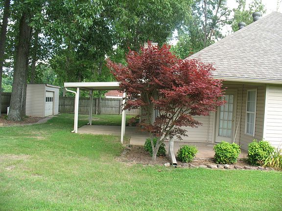 Separate dining room; Kitchen has dining area, solid surface countertops, smooth-top electric range, and pantry; Floors consists of carpet, ceramic tile, and wood; Two-car garage; Two covered patios on back of house; Fireplace with gas-burning logs; Storage building; Fenced back yard