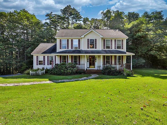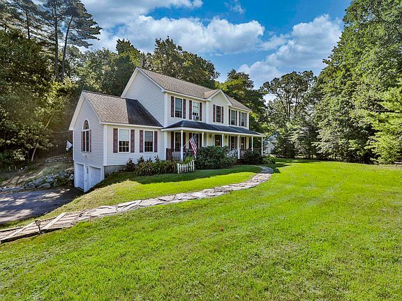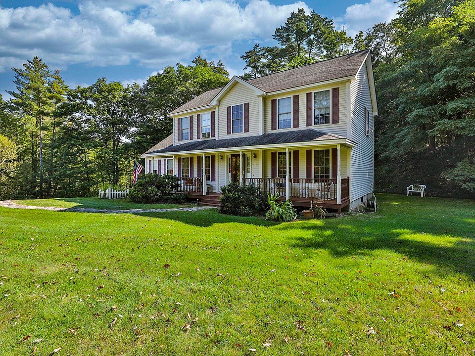 Classic Colonial located on a quiet hillside in Goffstown. This home features 3 bedrooms and 2 and a half baths. The 1st floor boasts a welcoming foyer with cathedral ceiling, a formal living room and large formal dining with hardwood flooring. The expansive eat-in kitchen with breakfast bar and tons of cabinetry opens up to the light and bright family room with vaulted ceiling and newer carpeting. Sliders off the kitchen lead to the spacious deck and the secluded back yard. A half bath with laundry completes the main level. Moving upstairs you'll find 2 well proportioned bedrooms, full bath and an enormous primary suite with walk-in closet and primary bath. The basement included a large 2 stall garage and plenty of storage space. Outside you'll enjoy sitting on the covered front porch overlooking this large and private setting. Enjoy this country setting and all the peace and quiet it affords while only 10 minutes to downtown Manchester with easy access to entertainment, shopping, restaurants and highways. SHOWINGS BEGIN SATURDAY, SEPT 16TH. OPEN HOUSE SUNDAY, SEPT 17TH FROM 12NOON TO 2PM.
