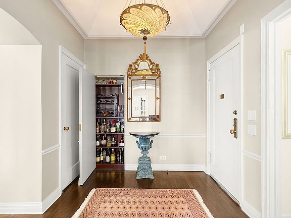 Upon greeting your guests in the elegant and spacious foyer with its 10 foot + cove ceiling, coat closet and smartly-designed bar closet, you're all set to take them through the arched doorway to the sunlit 24 x 15 living room showcasing a working wood burning fireplace, a large walk-in closet (which some residents convert into a home office), high double cove ceilings, and wonderful south-facing views through recently installed new casement windows. Alternatively, you can take your guests in through the columned entryway of the dining room which seats 4 to 6 people comfortably, and is equipped with built-in storage and is also with a high cove ceiling. French doors from the dining room lead into the bright windowed kitchen, a chef's dream! It features elegant soapstone countertops, tastefully appointed wood cabinetry, and high-end appliances including a Viking gas range, paneled Subzero fridge freezer, paneled Miele dishwasher, and Dacor microwave oven.