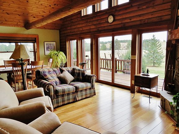 Impressive country home & horse property located just a few miles SE of Lewistown on 20 + acres! Previously remodeled this exceptional frame built home with log siding has numerous high quality upgrades. Hardwood Cherry flooring, Cherry French & interior doors, granite kitchen counters, newer appliances, Knotty Pine cathedral ceilings and open log beams, A-frame windows, fireplace, 4 bedrooms including main floor master bedroom suite & guest suite in the loft, main floor laundry, full finished basement with media room & 6 theater chairs and gas burning stove. From the living room, one can exit to the private wood deck with spectacular views of the Snowy Mountains. Underground sprinklers, pine trees and mature landscaping. Spacious attached three car garage with work benches, storage shed and horse barn with tack rooms, two stalls, Richi automatic water & feeders. This is a must see premier property!