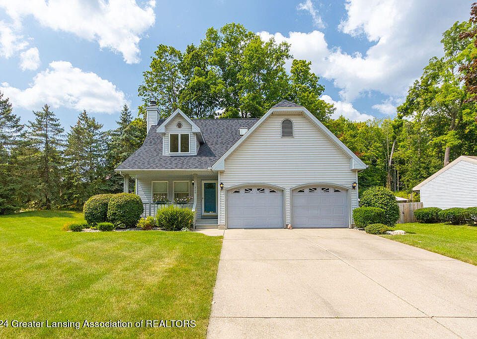 Delta Township, Grand Ledge Schools: This absolutely charming custom built 2,000(+-) square foot 3 bedroom and 3 full bath cape cod is nestled in The Williamsburg Subdivision! Enjoy the quaint facade and usable covered front porch to sip your morning coffee and watch the sun rise. This extremely well cared for home invites you in. The special ceiling heights and dormer window add amazing light to the living space. The great room is anchored by a wood burning fireplace for real ambiance and can be enjoyed by the dining area and the open kitchen. Gleaming quartz countertops grace the workspace with great cabinet space, an eating bar, newer stainless steel 3 door refrigerator, plus hardwood floors in the well laid out and efficient kitchen. Bring the outdoors in with the family room off the kitchen adorned with floor to ceiling windows and outside access! The large side yard and back yard is fully landscaped with large mature trees for privacy and in-ground irrigation too. This home is the perfect house for all ages with a spacious main floor primary suite including two closets plus a linen closet and direct access to a full bath with a skylight. The back hall makes way to the two-car garage with two overhead doors. Two wonderful bedrooms on the second floor. One has a walk-in attic and could easily be finished into more living space! The pretty, full bath includes a skylight, and a mud set ceramic tub/ shower! Do you need more living space? The finished lower level with side windows (may or may not meet egress) is the perfect place for you! Media and game areas plus a full bath and could easily be a 4th bedroom with small changes. The roof was RE shingled in 2023. Walking distance to Delta Center Elementary. Close to highway access, shopping, eateries, parks and more. Seller reserves: Light over the game table and built in shelving in the lower level, plus the freezer, workbench, and grill in the garage.
