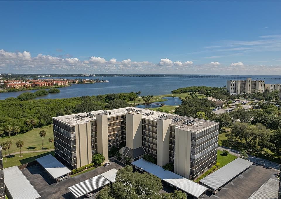 Beautiful top floor condo in the Cove Cay Community of Village IV. Spectacular 2 Bedroom 2 Bath Condo located on the 7th Floor, with views that are breathtaking overlooking the Tampa Bay and the Golf Course. The Community has lush Florida tropical landscaping and is a true private paradise! Updated kitchen with modern floor tile, neutral in color with custom wood cabinetry, granite countertops, closet pantry and appliances included. Kitchen includes option of eat in space. Living and dining areas are open concept which are great for entertaining. Hardwood flooring throughout living, dining, and bedrooms. Lanai offers the option with enclosed sliding doors or can be opened and used as a screened enclosure to enjoy your outdoor living; offers extended living area with direct access from the living area and/or primary bedroom. With the bumped-out L-shape, the Lanai has fantastic views of Tampa Bay and the Cove Cay Golf Course! Private laundry room includes full size washer and dryer. The square footage of 1,080 and unique lanai makes this one of Cove Cay's most popular condos. Great location with easy access to shopping, restaurants, and the beaches. The Cove Cay Golf Course is available for public play and offers membership. Marina with various types of membership. This is a 24/7 security gated community.