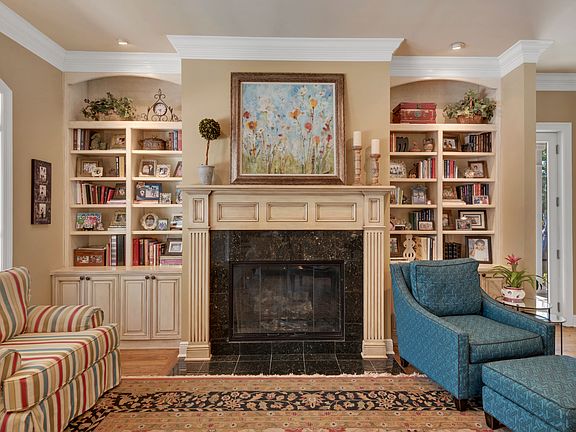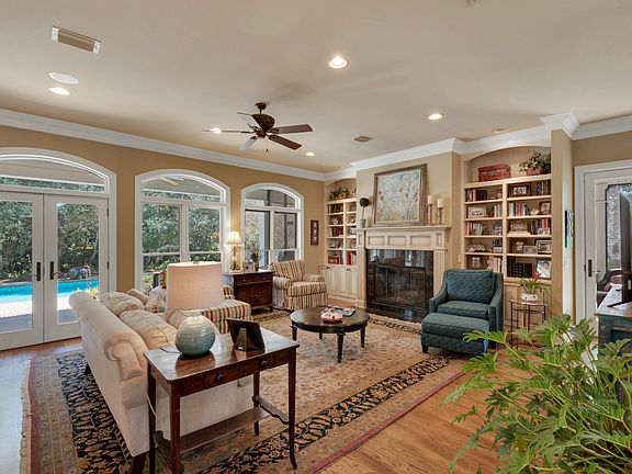 - Interior: Fireplace Gas, Plantation Shutters, Ceiling Crwn Molding, Floor Hardwood, Lighting Recessed, Washer/Dryer Hookup, Ceiling Raised, Floor Tile, Floor WW Carpet, Pantry, Split Bedroom, Window Treatment All, Breakfast Bar, Built-In Bookcases, Kitchen Island, Security System, Fireplace 2+, Inside Storage