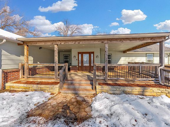 Welcome to your new country-living lifestyle within the Wichita city limits! Just off 254's Hillside/45th exit, embrace the vast privacy & openness of 1.35 acres neighboring an equestrian veterinary clinic. A U-shaped driveway makes for safe access with a large covered front patio sure to offer unforgettable sunset views with growing foals in the near distance. The front decking also offers a zero-entry ramp or steps leading to a foyer entry with heated tile flooring. Upon walking through the foyer, you will find a large living area with a wood burning fireplace and new luxury vinyl flooring. On the East side of this 1808 sq ft. ranch style home, sit two generously sized bedrooms, an updated bathroom, and a large storage closet. The North side of the home supports a separate laundry room and a spacious kitchen with formal dining space. Boasting with new flooring, large pantry (including a ~10ft ‘hidey-hole’ storage space), granite countertops, a large island/eating bar, natural lighting, and plenty of cabinet space, this fully equipped kitchen is sure to bring ease to making many great memories. The 2-car garage and additional 600 sqft attic space is a do-it-yourselfer’s paradise containing plenty of storage space with built-in cabinetry, toolbox, and folding tables along the perimeter in addition to a ceiling mounted heater and air compressor connections. Last but not least, the backyard includes not only a cozy campfire seating area, but also a generously sized storage shed for firewood, lawn equipment, etc. Don't miss this opportunity for farmhouse living with quick, easy access to all of Wichita!