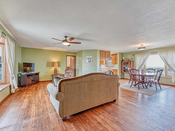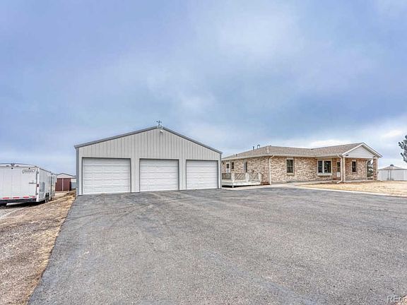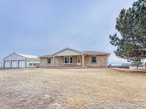 SUNRISE TO SUNSET you have it all! Sunrise & Creek Bottom views from your kitchen/dining in AM to Sunset and Mountain Views in PM! Wild Life to view at their time of presence!Looks.. can be deceiving, sq ft is 3416.. U MUST C and U WILL WANT this 4+ bedroom 3 bath with covered front patio facing West, then your East South East views of Creek Bottom/Open Space from your brick patio, play area for little ones, with Barbecue area to socialize! DO NOT forget huge deck (painting in progress)..what more could U wish for on 6.73 acres!3 Outbuildings, 1 is part of garage..that is 36x72 with ceiling spray insulation, 2nd 24x40 and 3rd Garden Shed(classic grain bin wood lined). Your choice of use Horses/animals to car collectors, mechanics you have space both large sheds are concreted, room for farm equipment, RV Inside Parking, Boats, Horse stalls.. all your toys!Moving inside, gorgeous kitchen, Oak Cabinets, large bedrooms with living/dining room open concept, large finished basement with a great kitchen & storage area, plus office (or choice of another bedroom) then wow, huge room recreation..or! with surround sound, open light & bright with walkout to concrete patio. All new LED light fixtures throughout and new ceiling fans as well. BRICK RANCH STYLE LIFE! FRESH COUNTRY AIR! Easy access to I-70 corridor.Drive time to DIA/Denver is 30 to 45 minutes, at this time no traffic lights! a beautiful view of mountains on your drive into Denver NOT stop n go traffic! New septic tank in progress. Gas to back patio for Barbecue. All window coverings stay.Also a pellet stove was used in basement, then removed so flue access in place should you reinstall a pellet stove! nice option!Yes... carpet needs modernizing so seller is offering carpet allowance of $3000.....so buyer can choose your own style and color!1 HOUR notice is required to show. Look forward to showing this CUSTOM home, you will not be disappointed! Work in Progress for clearing all sheds and acreage cleanup.