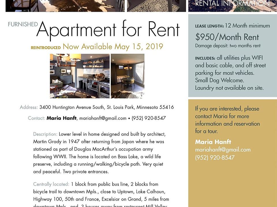 Call or Email me to schedule time Description: Lower level in home designed and built by architect, Martin Grady in 1947 after returning from Japan where he was stationed as part of Douglas MacArthur s occupation army following WWII. The home is located on Bass Lake, a wild life preserve, including a running/walking/bicycle path. Very quiet and peaceful. Two private entrances. Centrally located: 1 block from public bus line, 2 blocks from bicycle trail to downtown Mpls., close to Uptown, Lake Calhoun, Highway 100, 50th and France, Excelsior on Grand, 5 miles from downtown Mpls., and. 3 houses away from restaurant Mill Valley Kitchen at Excelsior Blvd. and France Ave. S. Size: 400 square feet. Wonderfully fresh looking and feeling. Everything has been refurbished or purchased new: window treatments, furniture, kitchen appliances, finishes, bedding, cookware, and dishes. (RLNE4872764)