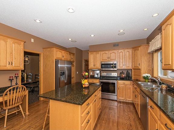 Custom one-owner home set on a 1 acre lot at the end of the street. Outstanding privacy and views! Shows like a model home! New stainless appliances in the granite center island kitchen opens to main floor family room with fireplace. Plus deck with incredible views! Vaulted master suite with whirlpool bath, 4 bedrooms up. Walkout level was finished later with maple woodwork, a fantastic bar with granite island, fireplace and wall of builtins. A few blocks to the trail, boat launch and park! Full brochure description: When you enter the home you will appreciate the spacious two story entryway. To your left is an arch and columns entering the formal dining room. To your right is the formal living room, arch and columns frame the entry to the main floor family room. Both the dining and living rooms have custom window blinds. The large kitchen features custom raised panel cabinetry, granite counter tops and brand new stainless appliances. You will also appreciate the recessed lighting, hardwood floors, desk and stereo speakers. The main floor family room offers a gas fireplace with natural stone surround and a mantle. There are custom built in shelves on either side, surround sound speakers and a large picture window overlooks the private, wooded back yard. You will discover a handy half bath with hardwood floor. A very spacious laundry mudroom includes updated front load washer and dryer, sink, cabinet, coat closet and security panel. The big three stall garage has freshly painted and insulated walls, backup generator hook up for the main floor, lawn sprinkler and invisible fence controls. The thirds stall is oversized and 25 feet deep! Upstairs you will find the vaulted master suite featuring a private bath, walk in closet and ceiling fan. The master bath is finished with a whirlpool tub, separate shower, double vanity and ceramic tile. Two large windows look out to the private, wooded back yard. There are 3 more bedrooms on this level of the home. The rooms have large windows to let in plenty of natural light plus there are spacious closets. Off the hall you will find a full bath with ceramic tile floor. You will notice quality woodwork and solid, 6 panel hardwood doors. The upstairs hallway is very open overlooking the two story entryway. The newer finished walkout level is outstanding! The amusement room includes a home entertainment area with a wall of custom maple cabinetry and a gas fireplace. There is plush carpeting, recessed lighting and two sliding doors for natural light. Enjoy entertaining in the bar area custom maple cabinetry, large island, granite counter tops, slate back splash, stainless refrigerator and stereo speakers. There is a wonderful screen porch with slate floor that overlooks the back yard and woods. There is a hook up here for a future hot tub. The 5th bedroom is on this level. It offers 2 large closets, recessed lighting and a large window facing the back yard. A pocket door enters the weight room or office with a large mirror, recessed lighting and nice storage under the stairs. You will also discover a very nice bath with raised vanity, shower, slate floor and stereo speaker. Off the hall you will find a sauna and cedar lined closet. The mechanical room holds the furnace, central air, the air exchange, water softener plus iron filter, April Aire and RO filter. This wonderful neighborhood is just a block or two from the park, the Dakota Trail and Halstead Bay boat launch. The Westonka Schools are some of the best in the state!