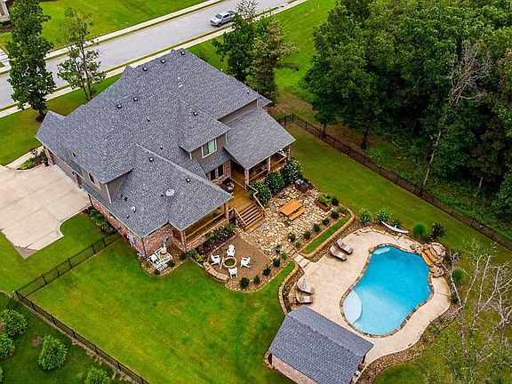 Fantastic Backyard Oasis in Oak Tree! Sitting on a 2 acre wooded lot featuring Custom-built Heated Pool with Waterfall and Tanning Ledge, Covered Cabana, Firepit and Extensive lush landscaping! Home features over 5000 sfeet, 5 BD (2 on main level), 4 full baths, 2 half baths. Stunning Grand Entry w/curved staircase, Media Room equipped with 100" electronic screen & wet bar, Game Room, Gourmet Kitchen, Butler's pantry, Designer baths, Wood Paneled Library. Oversized 3 car garage, and TONS of storage space. Outdoor additional amenities include 2 covered porches, outdoor kitchen, grill, and extended flagstone patio. Never leave home, as this home has it all!