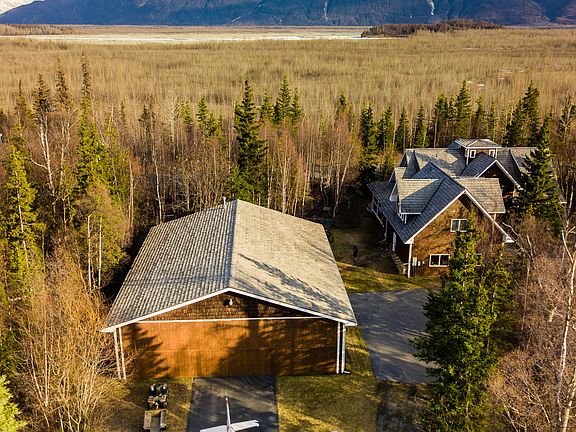 Custom hangar home in a private setting facing Pioneer Peak. Home sits on 1.5 acres in a quiet gated airport neighborhood just 45 minutes from Anchorage The In-floor heat and a soap stone wood stove provides a very cozy atmosphere. All bedrooms feature their own bathrooms with the first-floor master enjoying an enclosed steam shower.