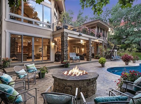 Designed by world-renowned architect Scott Bickford, this stunning reverse 1.5 story home has enviable contemporary-rustic style. Boasting 8,555 sqft with 5 beds, 5.1 baths, 7 fireplaces & a 4-car garage. It features an open layout, with floor-to-ceiling windows lining the entire back of the home. Serene wooded and golf course views, cathedral ceilings and hand-finished hardwood floors highlight the main level. The eat-in kitchen has granite counters, walk-in pantry and chef-grade appliances that opens up to a breakfast area & hearth room. An office with pocket doors, screened-in porch, deck, and mudroom are just steps away. The centrally located dining room includes a built-in buffet with back-lit cabinets and granite; complimented by custom herringbone wood floors. Custom natural stonework accents the rustic charm of the home, surrounding all four living area fireplaces—located in the hearth room & great room on the main level, and at either end of the huge family room on the lower level. The main level primary suite features a pass-thru fireplace, built-in storage, a huge walk-in closet with a central island and a spa-like bath with his & hers vanities, dual entry walk-in shower with bench, and a Whirlpool tub. A study with built-in desk and bookcases is next door to the primary suite. An open staircase leads to the window-lined lower level, which has a full bar centered in the huge family room. Additionally, 4 bedrooms, 4 full baths, a walk-in sauna, a cedar closet & lots of storage fill the lower level. Outdoors, the tree-lined 2.38 acre property ensures privacy, while spectacular panoramic views of the Hallbrook Country Club golf course greens, a salt-water pool and lush landscaping delight your senses. Entertainment space abounds with the large deck, covered patio, fire pit & 2 outdoor fireplaces. Located in the heart of Leawood, this one-of-a-kind home is close to the area’s best dining and shopping and Blue Valley schools.