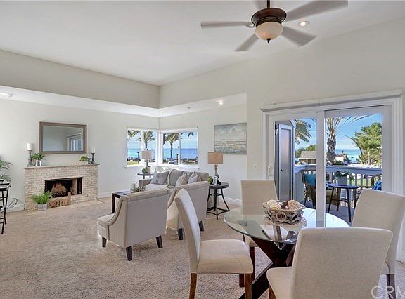 Stunning Ocean View front row upper unit. Gaze at the ocean from almost any room - living areas, bedrooms and both patios! This unparalleled opportunity for a beach close getaway has been updated throughout and is completely turnkey! Blue water from wall-to-wall upon entry with Catalina and San Clemente Island sunset views. Starting with the living room, there are vaulted ceilings, great light and a cozy fireplace. The dining room features recessed lighting with patio door to the ocean view entertainer's deck. Back off the dining room is the fully updated kitchen with granite counters, recessed lighting, an abundance of prep and storage space, updated appliances including a top of the line induction range with oven and warming drawer, microwave and dishwasher. Off the living/dining rooms are the two ocean view bedrooms each with vaulted ceilings, mirror closet doors, great closet space, separate patio access with ocean views, upgraded bathrooms and indoor laundry. Imagine relaxing in the living room, or entertaining on the deck, to unimaginable sunset views or walking across the street to the Strand Beach or the resort style pool. Enjoy living the beachside resort lifestyle with enviable proximity to the ocean, world class resorts, Dana Point Harbor, and the new downtown Dana Point, with dining, shopping and entertainment. Truly a must see!