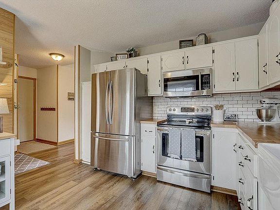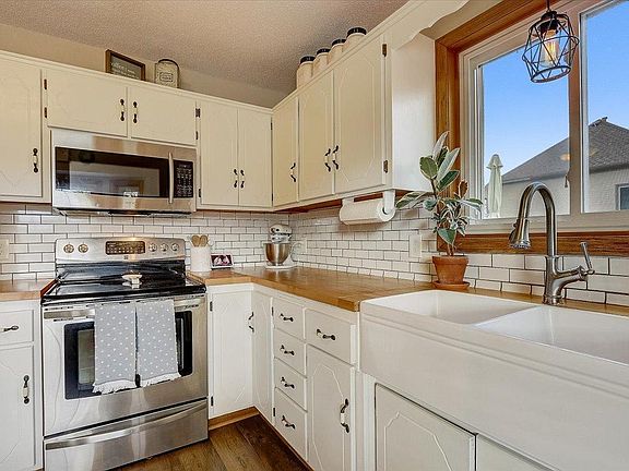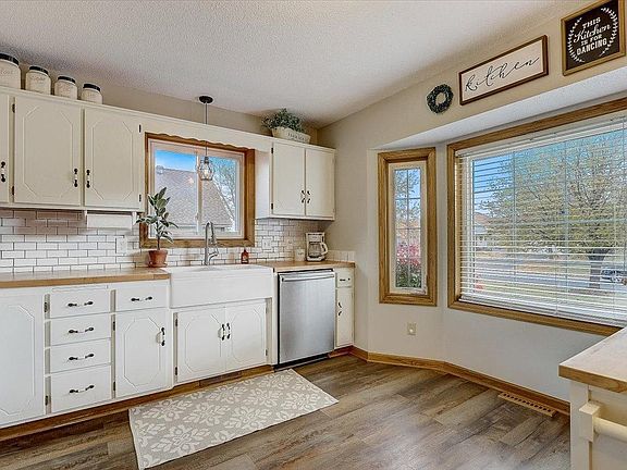 This charming 3 bedroom, 3 bath home is located just minutes from any shopping needs. It is ready to move right into. Updated kitchen, Newer windows, newer furnace, new carpet in living room & stairs and hallway, new flooring in dining and kitchen area. Updated kitchen with new backsplash, Farmhouse style sink, stainless appliances. Perfect for outdoor entertaining with large deck, basketball court, flat and partially fenced yard. The heated garage is set up for year-round use with built-in bar that folds up for full garage parking, epoxy floors, etc. Large open spaces, three bedrooms up, eat-in-kitchen and formal dining. Concrete driveway can accommodate three cars.