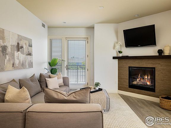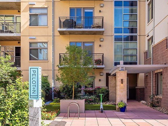 A coveted Boulder lifestyle awaits in this residence situated within the Peloton community. Located in a sought-after end unit next to the community/fitness center, this peaceful escape beams with morning sunshine from large east-facing windows. An open and spacious floorplan unfolds with beautiful light wood flooring with stylish finishes throughout, including a Calcutta marble backsplash, high ceilings, quartz countertops. Contemporary pendant lighting illuminates a center island in the kitchen complete with stainless steel appliances. The living area glows with ambiance from a modern fireplace. Open a glass door to reveal access to a private balcony showcasing stunning views of the Foothill mountain views. The gracious primary bedroom is complemented by a serene en-suite bath with a double vanity. A secondary bedroom and bath offer plenty of space for visiting guests. Residents of this secured building enjoy access to desirable amenities including a state-of-the-art fitness center, rooftop swimming pool and hot tubs, a quiet courtyard, stylish lounge area, movie theater and more.
