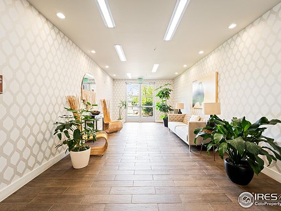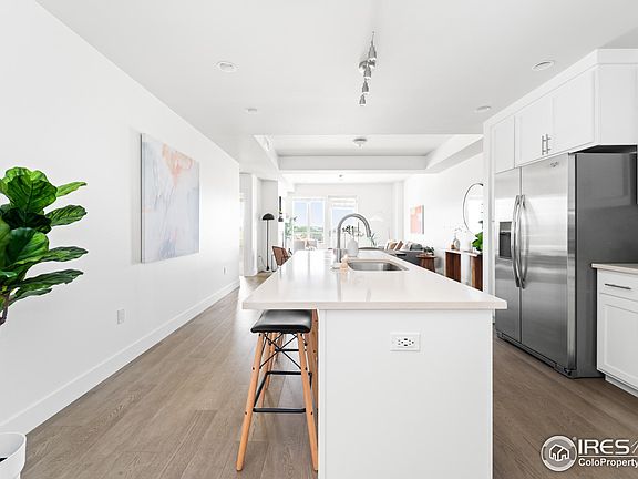 Majestic mountain views of the snow-capped back range and Boulder foothills unfold from this pristine Peloton residence. Situated in a top-floor, northwest corner placement, an abundance of natural light floods the interiors crafting a bright and airy atmosphere. An open, spacious floor plan cascades w/ handsome flooring. A center island w/ seating grounds a stylish kitchen complete w/ all-white cabinetry, quartz countertops, Calacatta marble and stainless steel appliances w/ a gas range. Adjoined for seamless entertaining, a dining area flows into a living room warmed by a modern gas fireplace. The space opens to a private outdoor balcony flaunting stunning views. Two sizable bedrooms w/ fresh paint and carpeting include a primary boasting a large walk-in closet and an en-suite bath. Residents of this secured building enjoy access to luxurious amenities including a private owner's clubhouse w/ a 24-hour fitness center, year-round pool and hot tubs, private event lounge, onsite eateries, underground parking and more.