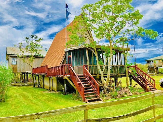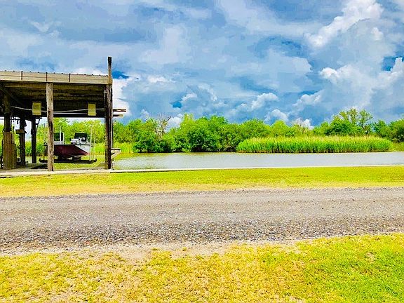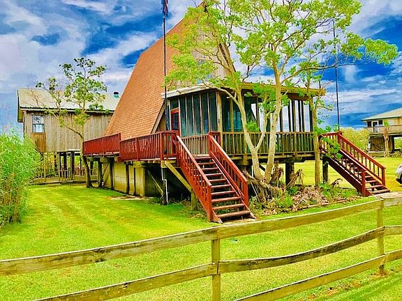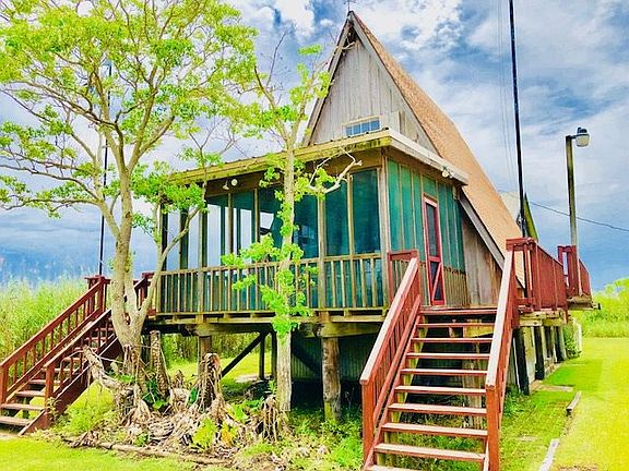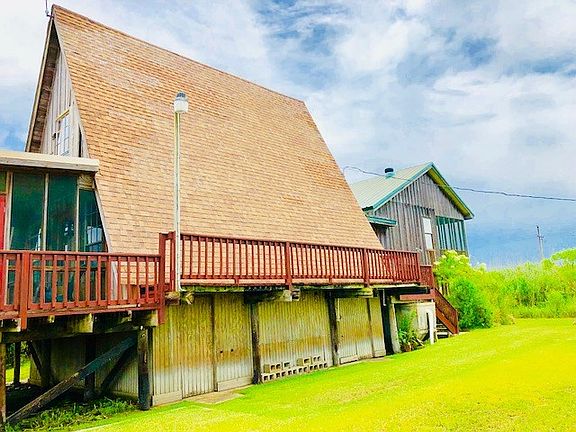 Unique and one of a kind. Nothing else like it on Bayou Dularge. This A-Framed camp will definitely be a conversation starter. This camp has the batture with a boat slip. Location of the camp is perfect if you are wanting to fish the Gulf of Mexico or any of the surrounding lakes as you will only need to idle for approx. 1 block before you can get on step and get to that honey hole! The bulkhead is made of creosote lumber with aluminum capping and tie-backs. Trenches were dug and sleepers were placed underground to reinforce the existing pilings and pilings were placed in the back of the property with hog wire to prevent floating debris. The master bedroom was done with cypress (walls and ceiling) and terracotta flooring. The other areas of the camp have the original hardwood flooring. This camp has lots of extras including a mudroom, lots of decking including a sundeck off the master bedroom, enclosed rear patio coming out of the master, screened in front porch and covered patio on ground level. Laundry room is located inside of the camp and has enough space to have an extra freezer to store all of the fish you catch! Second bedroom is located up stairs. Brand new window units installed that will heat and cool the entire camp. Buyer to verify all measurements and information contained herein. Flood zone subject to change without notice, buyer to verify. Property taxes at current list price. Actual property taxes are $93.00