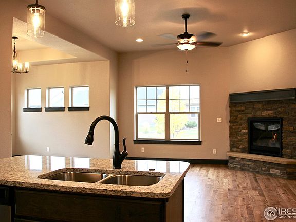The perfect "down-sized" ranch plan! Upscale finishes incl. slab granite, tile backsplash, SS appliances & wood floors throughout great room, kitchen, dining & hallway. Open floor plan w/beautiful corner gas fireplace in the great room. Lg. MB & bathroom w/granite counter tops, poured pan tile shower with bench. Walk-in closet has oodles of storage. Enjoy the wonderful Colorado weather on lg. covered patio (13' x 19'). 25' Deep garage. Homes are attached w/only one shared wall in the garage.