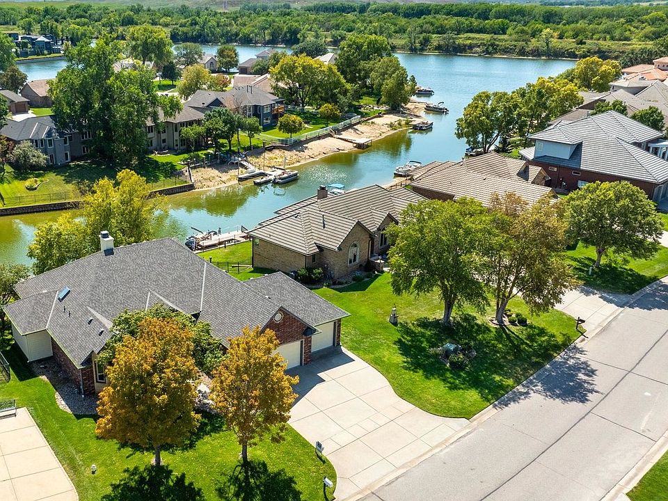 Waterfront @ The Moorings on Crystal Lake! Gorgeous updated home overlooking the 120+acre mile-long tree-lined lake beyond the backyard beach & dock...4+BR, 3.5 bath, deep 3-car garage and an open great room plan offering almost 4000sf (2150 main, 1810 in walkout) of premium quality finishes and luxury amenities. Nearly full brick & stone exterior, new Class 4 roof in '24, completely painted inside and out, custom-built glazed ash cabinetry and newly refinished solid oak flooring throughout entire main-level living areas, plus a fully finished walkout basement with slate floors everywhere except in the bedrooms...this home is ready move-in ready! The kitchen is a gourmet's delight, with Bosch double ovens, range & DW, huge granite work surfaces, and tons of cabinetry...plus a walk-in corner pantry and half bath right off the laundry & garage. MBR suite is 18x17 and boasts a bay window fireplace, corner Jetta tub and separate 6' shower plus a 15' long walk-in closet! BR#2 is also oversized @ 17x13 with a cozy bay window, as well. The DR features a built-in hutch & buffet with arched glass doors all open to the LR with stunning panoramic water views. The sunny breakfast nook makes for choice perch to start your day, and leads to the 10x24 composite covered deck with spiral staircase down to a large, shaded walkway to your private beach and boat dock. Fully finished walkout basement features beach-friendly slate floors everywhere except in the 2 lakeside BR's. Large wet bar w/full-size refrigerator plus room behind perfect for wine-cellar or office/den. Mature trees and a manicured landscape with sprinkler on well-water, all new Lennox HVAC July '21, new Class 4 roof and guttering May '24 means you'll enjoy a low-maintenance lifestyle (until that pontoon boat arrives!). There's a safe room under the front porch, and a pet-shower in the garage that's also a good place to wash off muddy boots or garden tools. No specials and HOA dues of only $15/mo., USD262 Valley Center Schools. Located close to shopping and easy access to entire Wichita metro area within 15 minutes via freeway. Don't Resort to Just Going Home...Go Home to a Resort!