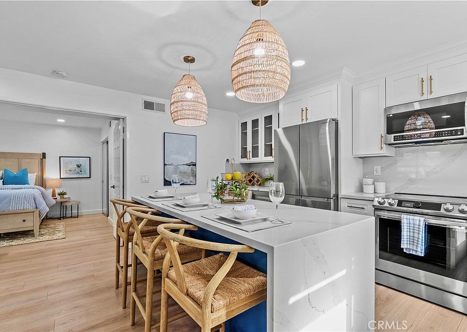 Inside, you'll find a light-filled living space, gorgeously remodeled kitchen with quartz countertops and a large island with double waterfall sides. The private patio offers a perfect spot for drinking your morning coffee with ocean breezes or relaxing after a day at the beach. The large master bedroom offers a serene retreat, while the full bath and well-appointed kitchen make everyday living effortless.