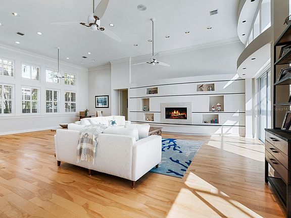 This custom-built masterpiece is situated on an oversized end lot in Corey's Landing; a premier gated community located in Bay Isles on Longboat Key. As you enter this contemporary 3 bedroom 4 1/2 bath home, the towering 14 ft ceilings and sprawling open floor plan will make your imagination run wild with how this incredibly versatile space can be shaped to fit your personal taste and lifestyle. The great room focal point is a sculptured wall with backlit recessed shelves to display art or other valuables and includes a modern integrated gas fireplace. Dual banks of 8' sliding doors allow an unobstructed view and access to the patio and pool area, ensconced in mature landscaping that forms a beautiful private oasis. There is an abundance of natural light, with custom silhouette blinds and plantation shutters throughout the home. The great room transitions effortlessly into the bonus room which has slight views across the golf course to Sarasota Bay. Similarly, the dining area is unified with the great room and adds a wonderful easy flow to this casually elegant space. The natural wood flooring throughout the home is a beautiful addition with natural hickory floors in the main areas and bedrooms, and Brazilian cherry wood in the kitchen. When it's time to prepare a meal, you will be delighted by the kitchen's design and chef-quality appliances. A large island with a Wolf cooktop and integrated vent, is surrounded by Persia Pearl granite, a double sink, a spacious dual pantry, and an eat-in kitchen area which provides access to the outdoor atrium garden. The owner's suite is very private with separate his/her baths, dual closets and walk-in showers, Carrera marble flooring, granite counters, and a large jetted bathtub. A large dressing room with abundant storage and a wall safe, plantation shutters as well as private access to the pool and patio area for a mid-night swim, is the perfect retreat for relaxing. The second and third bedrooms each have full en-suite bathrooms, include walk-in closets, and provides access to the pool area, via sliding glass doors. The pool area is made for entertaining with a summer kitchen, 2 story pool cage, separate cabana bath, travertine decking, and mature palms providing absolute privacy. The home has been smartly updated with hurricane shutters, and a new roof in 2017. The home is also handicap accessible and includes a FlexStep stairlift, a 2+ car garage with a workbench and great storage capability. Corey's Landing offers a maintenance free neighborhood that is pet friendly and has a community pool, two tennis courts, private kayak and SUP access to the Bay and a Ramada with restrooms for family gatherings. Enjoy Longboat Key's white sand Gulf beaches with private access to the Bay Isles Beach Club included in ownership. Longboat Key Club golf, tennis, the Moorings Yacht Club and Marina, shopping and St Armand's Circle are all convenient to this location. This stunning property is better than new, and ready to delight the next owner. Live the Longboat Key lifestyle you deserve today in this spectacular home!