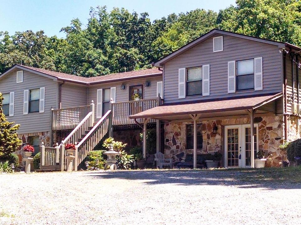 Unrestricted property, spacious custom home has 2 kitchens, 2 master suites, 2 living areas ; perfect for 2 families. Many custom features, screened back porch where you can enjoy the quiet country setting & the beautiful flowers, outdoor fireplace, guest house, barn, workshop, & pretty mountain view.Very special and simply wonderful. Would make a great place for family and or friends to share space!