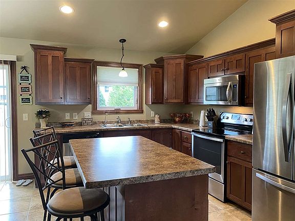 Feels like new! Pleasant one-story, walking distance to Red Smith School. Home has vaulted ceilings & open-concept design. Dark maple cabinetry, stainless steel appliances & island are key features in the kitchen. Living rm has vaulted ceiling and a decorative ledge for display. Split bedroom design with spacious master bedroom, walk-in closet and bath w/roomy shower (new glass drs). 2.5 Car garage is extra deep on one side, great for storage or parking extra toys. Lovely yard and new stamped concrete patio. LL offers egress window, stubbed bathroom and some framework- ready to finish.