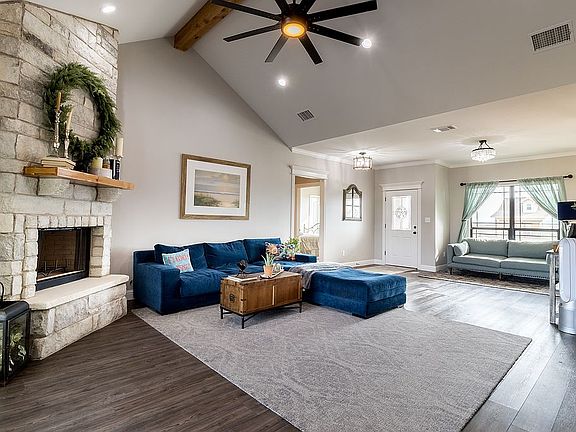 Custom built 1951 sq ft 1 year old home In Buffalo Heights subdivision spotless corner lot stone and stucco home. Looks brand new on 3/4 acre with 7,000 sq ft TifTuf bermuda grass overlooking the state park from the back porch. The flooring is 20mm LVT with foam underneath and ceramic throughout. Extra wide driveway, custom soft close cabinets, large utility room, whirlpool tub, shower with sit down bench, tray ceiling, dual flush toilet, USB outlet in all rooms, exterior walls have foam insulation, 5 inch baseboard throughout with trim in main room and kitchen. Pantry with glass door. WIFI garage door opener. Mud sink in utility room. 1 inch curtain rods on all windows. Shelf in utility room and shelf in kitchen stays if you want them. Water softener runs throughout the home and RO system under kitchen sink for drinking and cooking water which is hooked to ice maker too. 5 huge low e double pane windows. Outside soffit lighting. Refrigerator stays. Transfer warranty to new owners. Call Angie (903)617-3073 for showings. Frontier fiber just installed out front. Will pay buyers fee if have realtor. text or call. HOUSE FACES GREYWOLF on corner Ponca Path n Greywolf