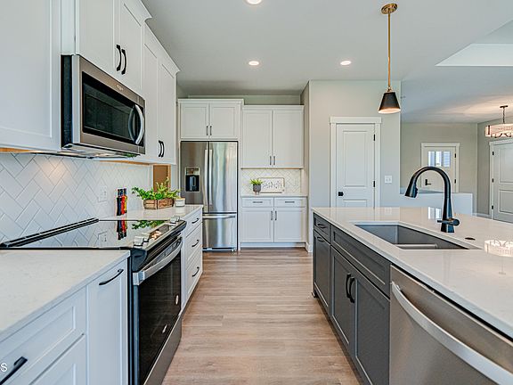 An inviting front porch states ''Welcome Home'' to this NEW construction Ranch style home located in NW Bismarck! Featuring the latest in modern and stylish design. Desirable 3 bedrooms on the main level including the laundry room w/cabinets. The primary suite offers a tiled shower, walk in closet and spacious vanity w/ dual sinks. The kitchen features quartz countertops, timeless backsplash, upgraded appliances and coffee bar counterspace. Relax in the comfortable living room w/ a gas fireplace and soft lighting. The dining room offers access to a covered maintenance free deck overlooking the private backyard w/ no direct neighbors. Unfinished lower level is already framed and ready for your own personal design that will accommodate another bathroom, 2 additional bedrooms, family room and an office or another bedroom if desired. Triple garage w/ floor drain, water and openers. See this NEW Home today!