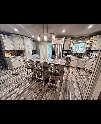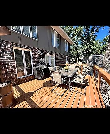 Beautifully Updated Home with so much charm & character. A portion of the home is a Historic Log Cabin (Logs from Mark Twain Forest). This updated home features a wonderful floorplan with a Beautifully remodeled kitchen w/stainless appliances, custom cabinets, large island and pantry. Home has a formal dining room area, living room on main level with wood stove, 2 guest bedrooms on main level, beautiful master suite with fireplace, master bath with jetted tub & dual vanities... lovely. Upper level features a large family room area with 3 additional bedrooms and bathroom. Large Deck and the Cutest front porch are a plus and great for relaxing and enjoying the Lake atmosphere! The lot is very gentle with a fenced in back yard, storage shed and 1 car detached garage included! All of this and includes a gentle lakefront lot located just across the street with your own private dock! Included is an additional lot with 30x40 Insulated Metal Building w/water, heat & electric.. perfect for all your toys!