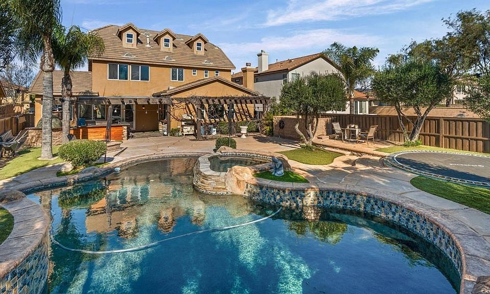 Welcome to 34025 Summit View Place! Exceptional luxury residence offering 5 bedrooms, 5 bathrooms in approximately 3,600 square feet of living space, and a resort-style backyard designed for unforgettable entertaining. This home blends elegance with thoughtful functionality across three expansive levels, ideal for growing households and multi-generational living! A downstairs bedroom offers convenience and flexibility for guests or extended family.The heart of the home, the chef’s kitchen showcases sleek quartz counter tops, custom cabinetry, high-end stainless steel appliances, farmhouse sink, and coveted double ovens, this place is anchored by an impressive center island perfect for hosting and gathering with ease! Living rooms stuns with high vaulted ceilings, recessed lighting, and a cozy fireplace framed by a warm wood mantel. Flowing seamlessly outdoors to the entertainer’s dream backyard where you'll find a built-in barbecue, pizza oven, mini fridge, and stone countertops all creating the ultimate open-air culinary experience. The resort ambiance continues with waterfalls flowing into your saltwater pool, jacuzzi/hot tub and even an in-ground trampoline, making this space as playful as it is luxurious. Upstairs, the 2nd level showcases two spacious bedrooms with Jack and Jill bathroom and an expansive space perfect for an office, den, or lounge. Your Primary retreat is complete with its own fireplace, Spa-like bathroom with a soaking tub, dual vanities and a an oversized walk in closet! The 3rd floor reveals a rare and highly desirable bonus private ensuite bedroom, perfect for teens, guests, or multi-generational living, featuring its own bathroom and shower for complete privacy. Every detail of this home is curated for elevated living. Whether hosting poolside gatherings, enjoying pizza nights under the stars, or relaxing fireside in your primary suite. A true statement property where luxury meets lifestyle.