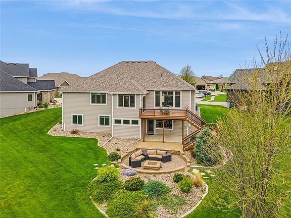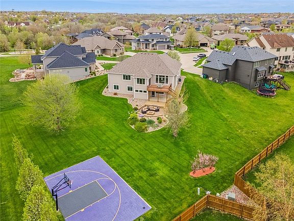 Stunning walkout ranch home in Urbandale! This home is perfectly located at the end of a cul-de-sac on a .57 acre lot! Outdoor living at its finest with an upper deck, lower patio, fire pit area and a basketball court or switch your sport to pickleball! Custom built by Braga Homes this home lives large! Two bedrooms two baths on the main floor and two bedrooms and two baths on the lower level. Over 3300 total sf. Character and quality are star players here with arched doorways, high ceilings, expansive Anderson windows, granite tops throughout, gleaming cherry hardwood floors, high-end Bosch appliances, built-in corner seating in kitchen dinette, 8' garage doors, maple wood wall in family room, lower level offers a huge 2nd family room, fireplace and an office area. Mature trees offer privacy when the party moves outdoors! Roof new in 2021. Waukee schools, close to parks, and walking trails.