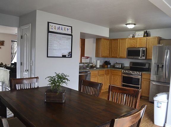 Spacious (3) level Living- TONS of updates: Front Room lighting, 1/2 bath main floor. Double Oven. Bsmt complete, and plumped for 4th bathroom or convert to 4th bedrm. Large shelves laundry room. Fully fenced backyard, extended deck, large doggy door and SHED.