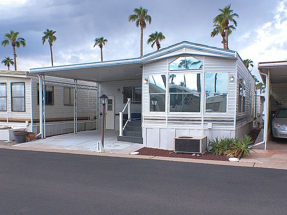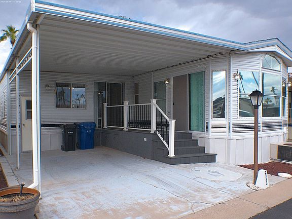 Located in a 55+ Community Center. This Park Model has a Raided Arizona Room is Move-in Ready for you. Front Porch is Composite Decking with Metal Handrails & Storage. Nice Interior Paint, Wood Like Laminate Floors & Carpet. Fully Furnished, Updated Light Fixtures, Galley Kitchen, SS Sink, White Appliances, Coffee Bar Area, New Cabinet Hardware, Remodeled Bathroom, Step-in Shower, Queen Bed, Built-in Drawers, Built-in Shelving with Stacked W/D in the AZ Room, Built-in Shed, Central A/C & Heat. Lot Rent is listed online as the monthly breakout cost that is due annually. Lot Rent Paid Until January 2026.