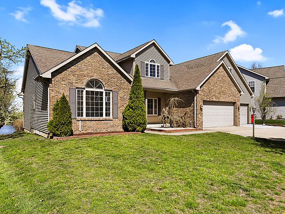 This newly updated waterfront home is yours for the taking! The welcoming entrance embraces you like a new construction home would with new vinyl plank flooring, new well-chosen carpet, fresh paint, and gorgeous light fixtures! The kitchen is new from top to bottom, featuring all stainless-steel appliances, gorgeous oatmeal-colored soft close cabinets, and stunning quartz countertops. The main floor features an office/bedroom, separate dining room, and living room with a gas fireplace with tall ceilings and a picturesque view of the lake and the Carle at the Fields development. Additionally, the first-floor master has a spacious walk-in closet and completely new full bath that features a stunning tiled shower with glass doors and a white vanity with double sinks. This expansive home features 3 bedrooms on the 2nd floor, a full bath, and bonus room over the garage. The finished basement offers 1 bedroom with an egress window, 3 additional unofficial bedrooms/flex rooms, a full bath, a living area with natural sunlight and waterfront views, and a small kitchenette. This house is perfectly situated on a quiet street in Cherry Hills Subdivision with a brick exterior, 3-car garage, and a lovely deck out the back to soak up the lake views. This is the home you have been waiting for, come experience the views today!